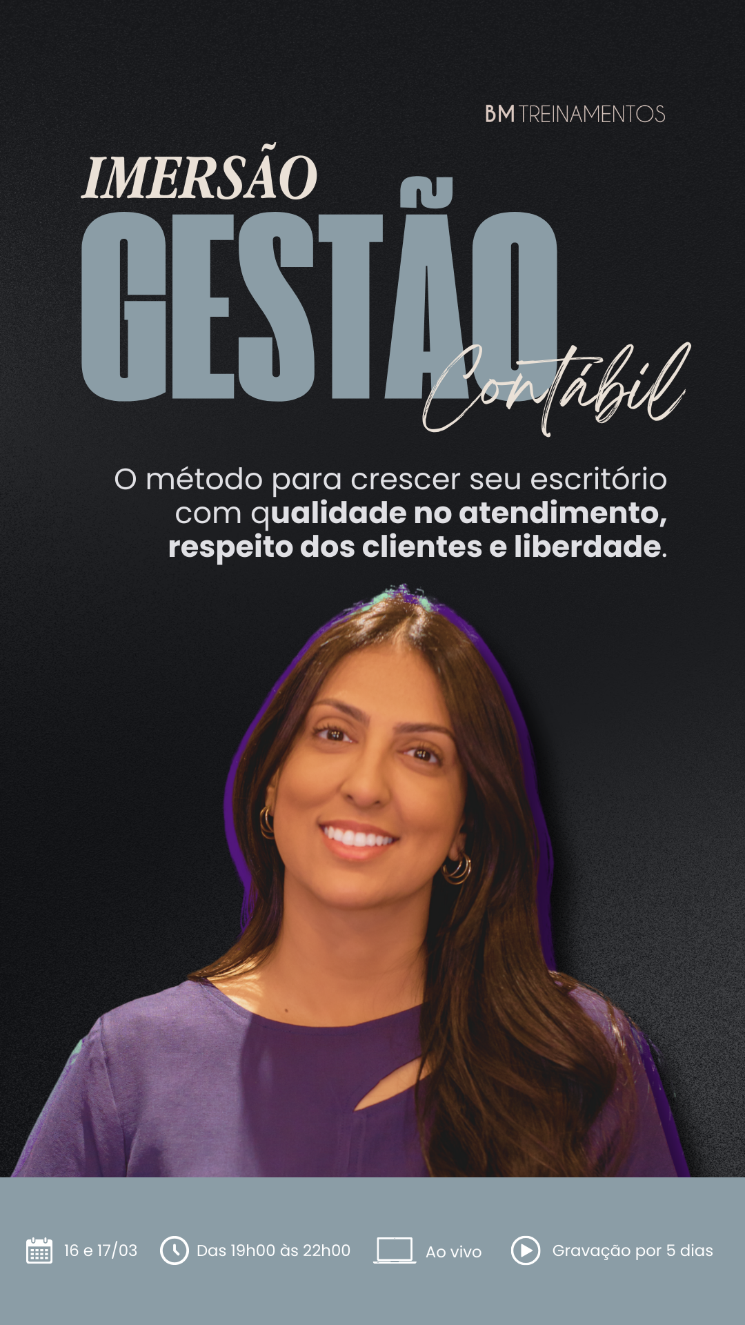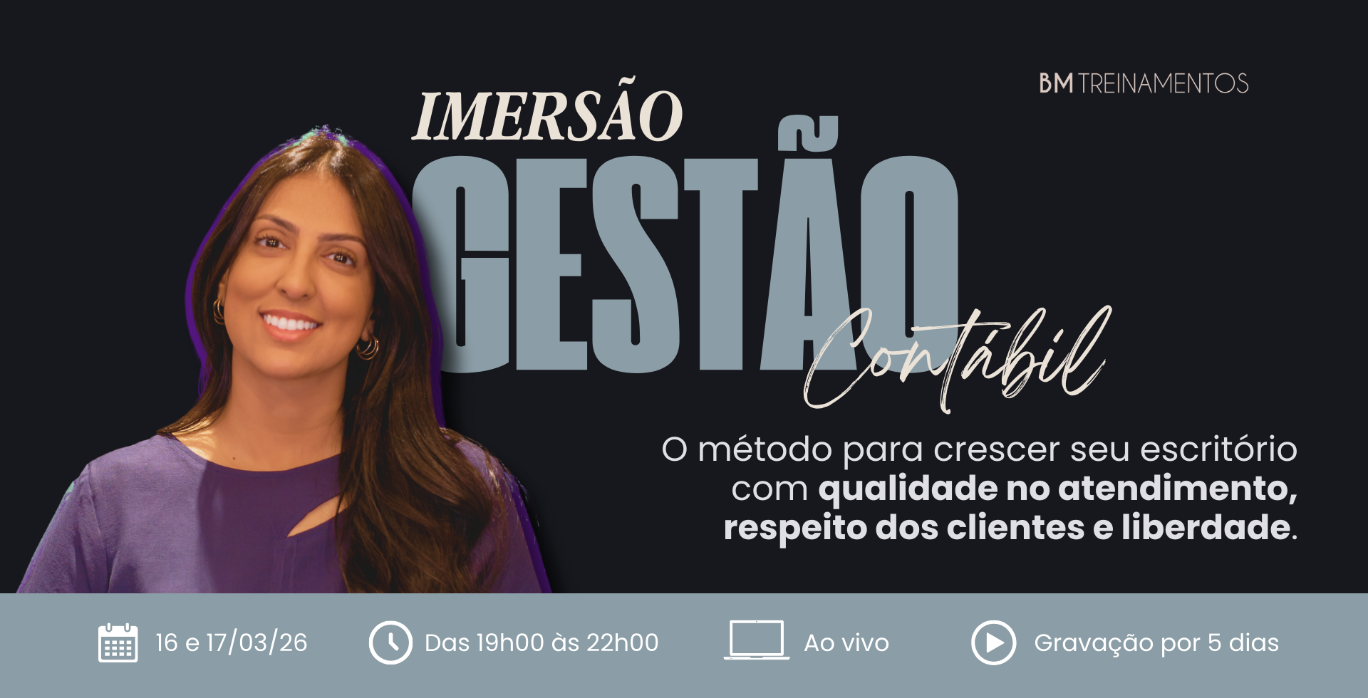 Contador(a), nesta Imersão eu vou te mostrar como organizei a gestão do meu próprio escritório para sair do operacional e assumir, de vez, o papel de dona do negócio.